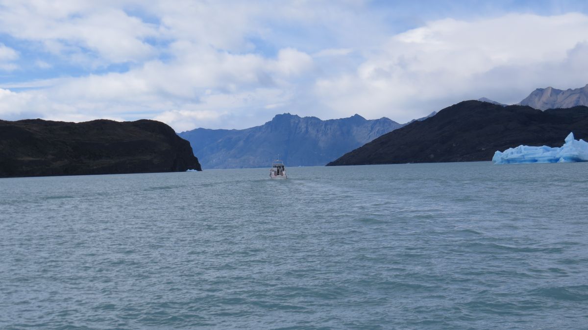 Vi har nu sett oss mätta på glaciären och åker ut ur Upsala-viken för att åka till estancian. Båten i bilden är del av samma tur.