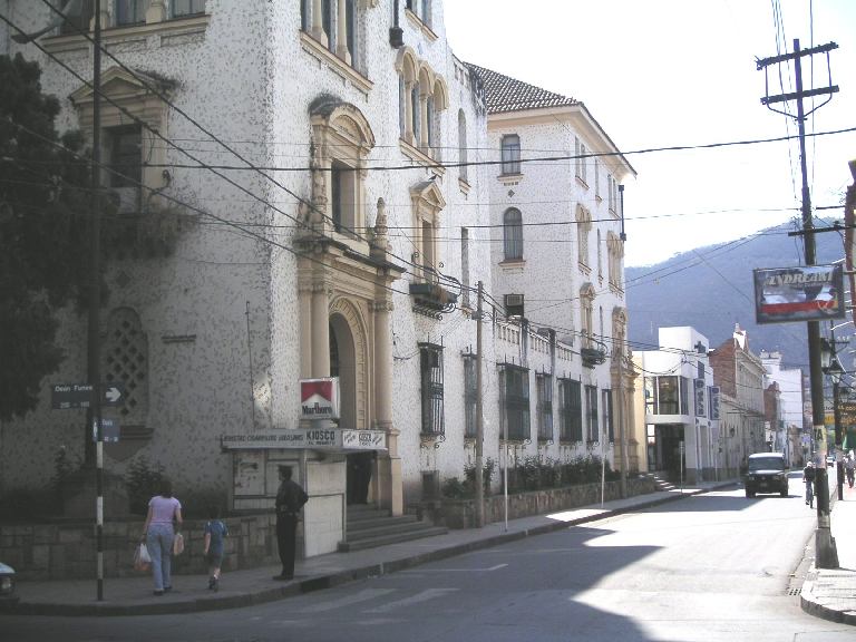Detta hus fascinerade mig. Är fasadputsen dålig, eller ska det vara så här? Eller har man bara gjord dygd av dålig puts? Min slutsats är nog att det ska vara så här, och då är det ett ganska digert jobb. Huset synes fungera som polisens lokala högkvarter. |