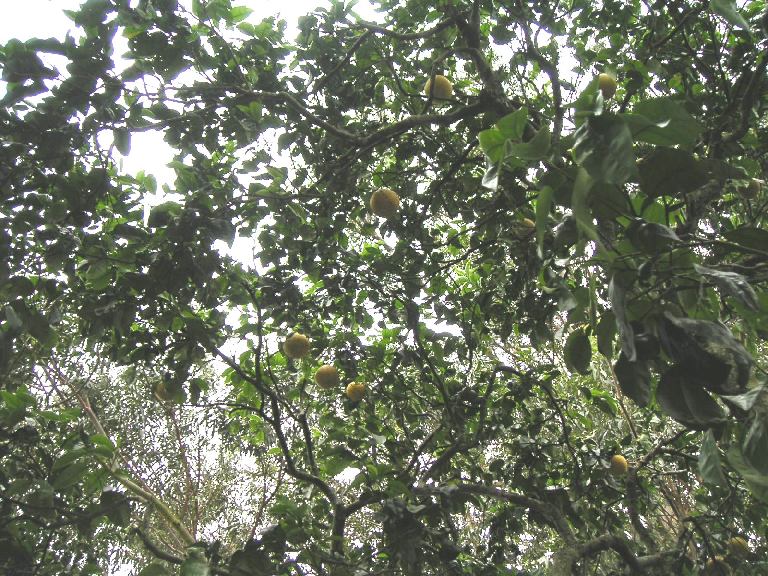 In the garden there was a grape-fruit tree with fruits still in the tree.