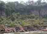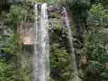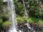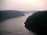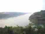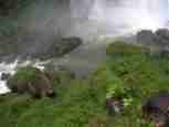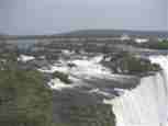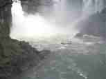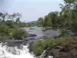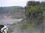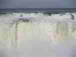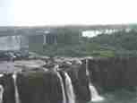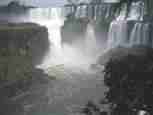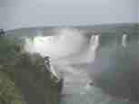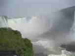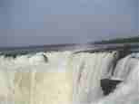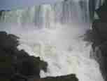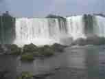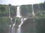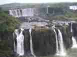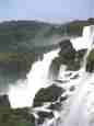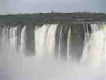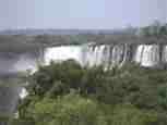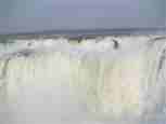 The Iguazú Falls on the border between Argentina and Brazil are among the mightiest water falls on this planet. Río Igauazú runs over a basalt layer that ends abruptly and is followed by soft sandstone. As a consequence, the river falls 80 metres in a number of falls spread out over the wide river.