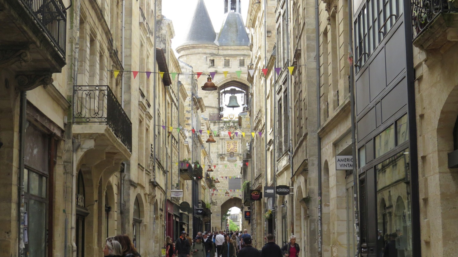 A spectacular bell tower squeezed in between the houses. There is a church adjacent to it on the other side.