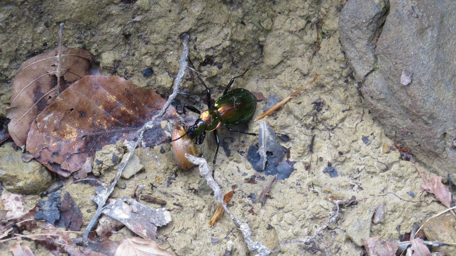 This beetle is trying to carry its goods forward, but this small twig comes in the way.