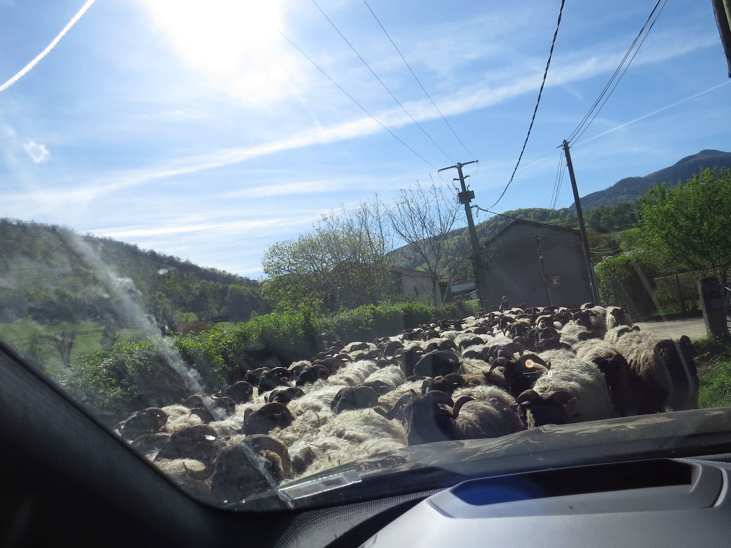 | This was slightly earlier, as I was driving to the walk. All of a sudden the small road was clogged with sheep, and more precisely rams. | ||||