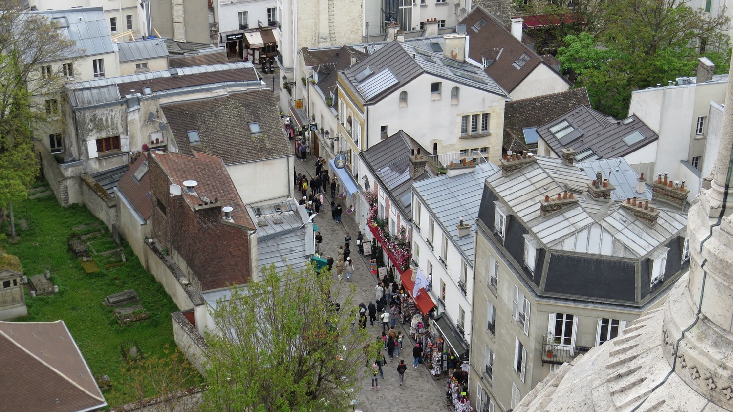 I've now climbed the dome of Sacré-Cœur and I am looking out over this lively and very touristic street.