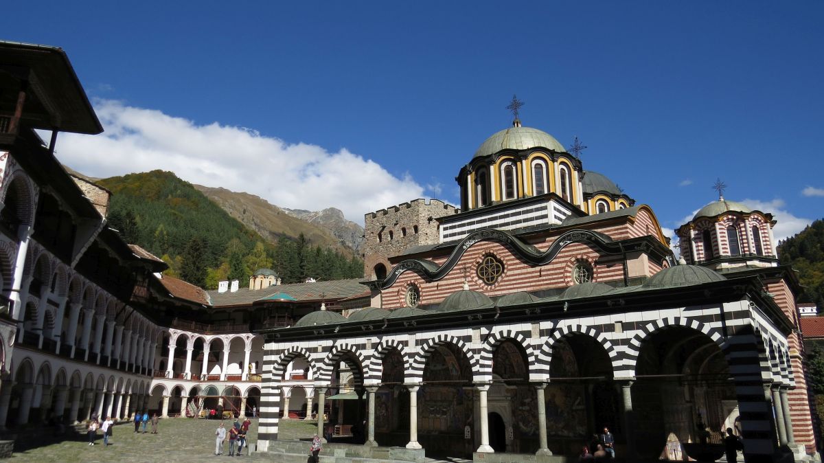 | Rila-klostret ligger mycket vackert i bergen. Det var alldeles nyrenoverat när jag besökte det och det är mycket stilfullt. Jag åt middag med en vän och hans fru på kvällen, och hon hade varit där två år tidigare, och då var det inte så här elegant. Och så hade jag tur med vädret! | ||