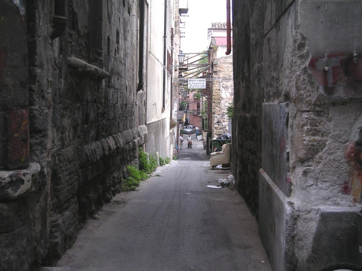 Palermo har kvar sitt medeltida centrum, och det är en mycket förvirrande historia. Det finns några moderna raka genomfartsgator, men i övrigt är det gator av varierande smalhet som går dit och hit. Man tittar på kartan, vet "nu är jag här och ska dit". Man går två kvarter, och man hamnade inte där man tänkte. Just den här gränden var en tvärgata till Via Divisi där mitt hotell låg. Skylten för Via Divisi var f ö trespråkig, förutom italienska, så stod den också på arabiska, och, tror jag, hindi. |