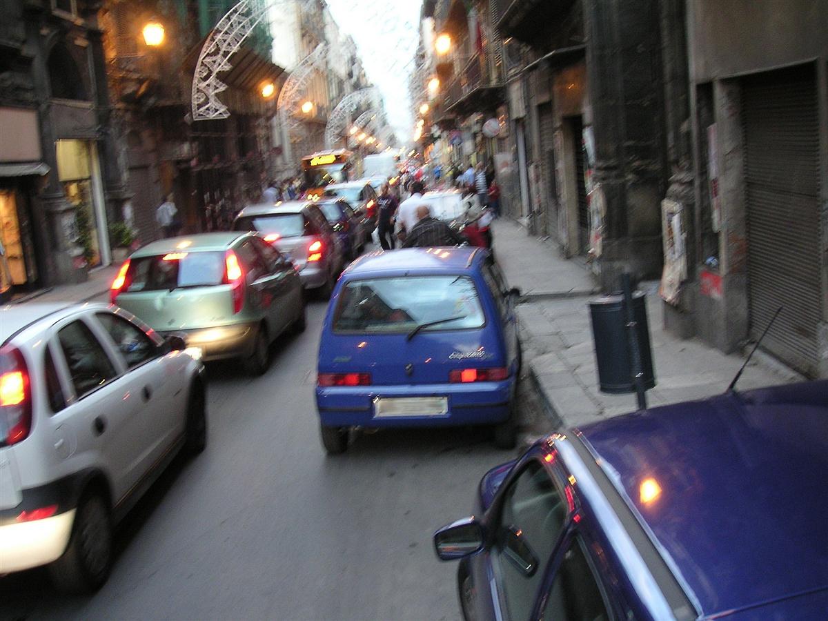 Tillbaka i Palermo, och det är skymning. Bilden är usel, men det ger en del av stämningen så här dags på dygnet. Längre fram på kvällen är det en annan sak. De flesta italienska städer av någon storlek brukar bjuda på ett rikt folkliv på kvällen, men i centrala Palermo är det ganska dött. |
