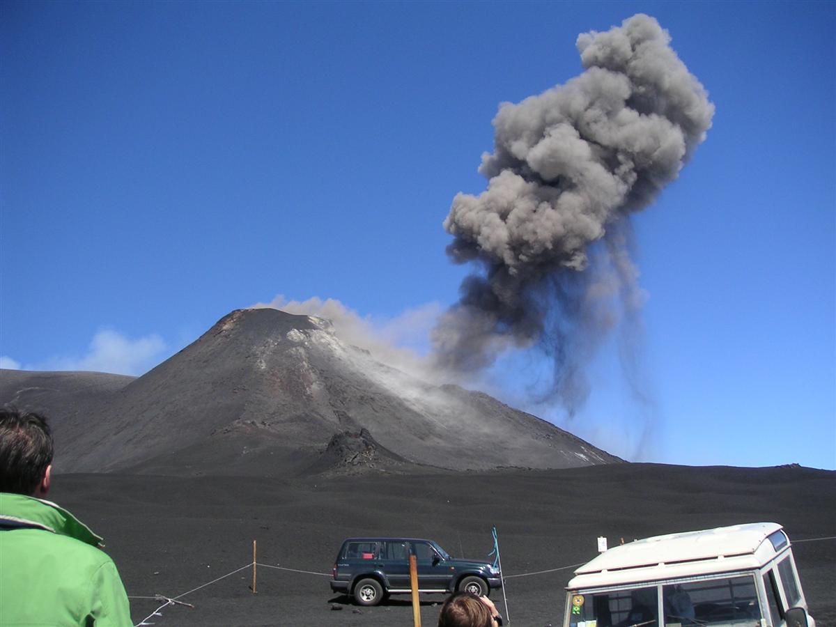 Där bussarna stannade hade guiderna hade en liten stuga med en enkel servering och souvenirförsäljning. Och som jag sitter och förtär min medtagna macka, så ååar folk till, och visst hände det prylar. Etna puffade ut rök från huvudkratern, vilket hände flera gånger. Och visst tyckte jag mig också höra ett muller ibland? |
