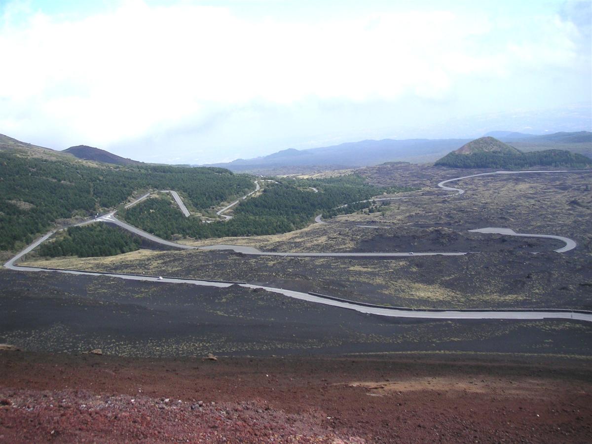 Jag åkte tillbaka med minibussarna och kabinbanan. Kring kabinbanans utgångspunkt finns det kaféer och souveniraffärer. Etna är en stor turistattraktion, och även om det var en fin dag med strålande vyer, så var det lite väl mycket internationell turism för min smak. Även härnere finns det kratrar lite här och var. Det här är bild från en sådan krater över de vägar som leder hit.. |