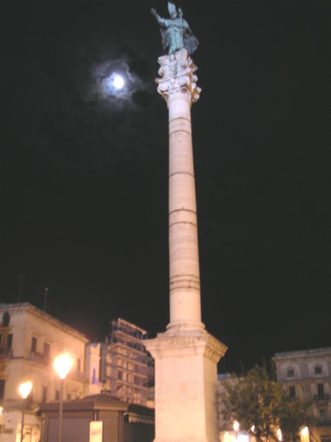 Piazza di Sant'Oronzo är centralpunkten i Lecce. Hittills har jag bara pratat kyrkor, men folklivet är värt att nämna. När jag kom på eftermiddagen var gatorna i gamla stan rätt öde, bara en och annan turist. Men på kvällen var det en helt annan sak. Då var det mycket folk ute, och det fanns diverse gycklare och musiker längs gator. Trevligt ställe. Den vita fläcken bredvid statyn är fullmånen. |