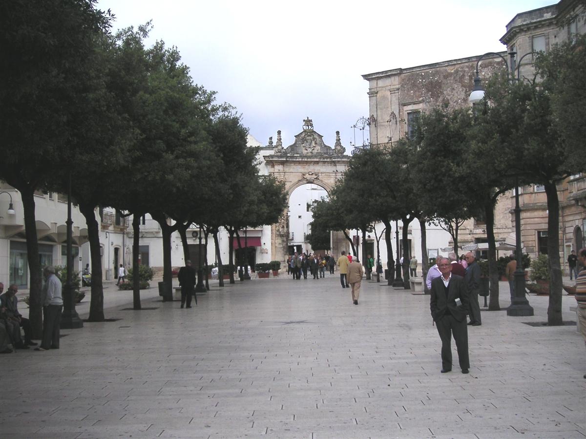 Martina Franca ligger norrut från Lecce, och faktiskt något närmare Matera än Lecce. Jag nådde staden som en dagsutflykt med lokaltåget från Lecce. Även Martina Franca är en stad med mycket barock-arkitektur. Som sevärdhet är den inte alls i klass med Lecce, men den är värd några timmar. Detta är i alla fall en piazza med en port till gamla stan i bakgrunden. |