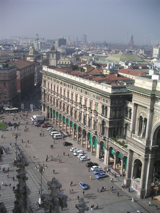 I förgrunden Piazza del Duomo. Till höger skymtar ingången till Galleria Vittorio Emanuele II.