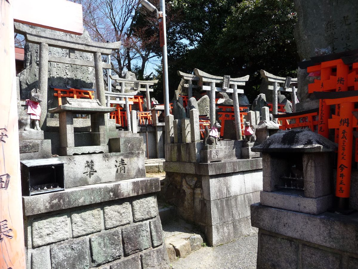 From the plateau, the path continues around the mountain to back to the plateau. Here and there are shrines or altars with small torii arcs, and also mini-cats with scarves. Hm wait, those are not cats, I believe they are foxes. Never mind. |