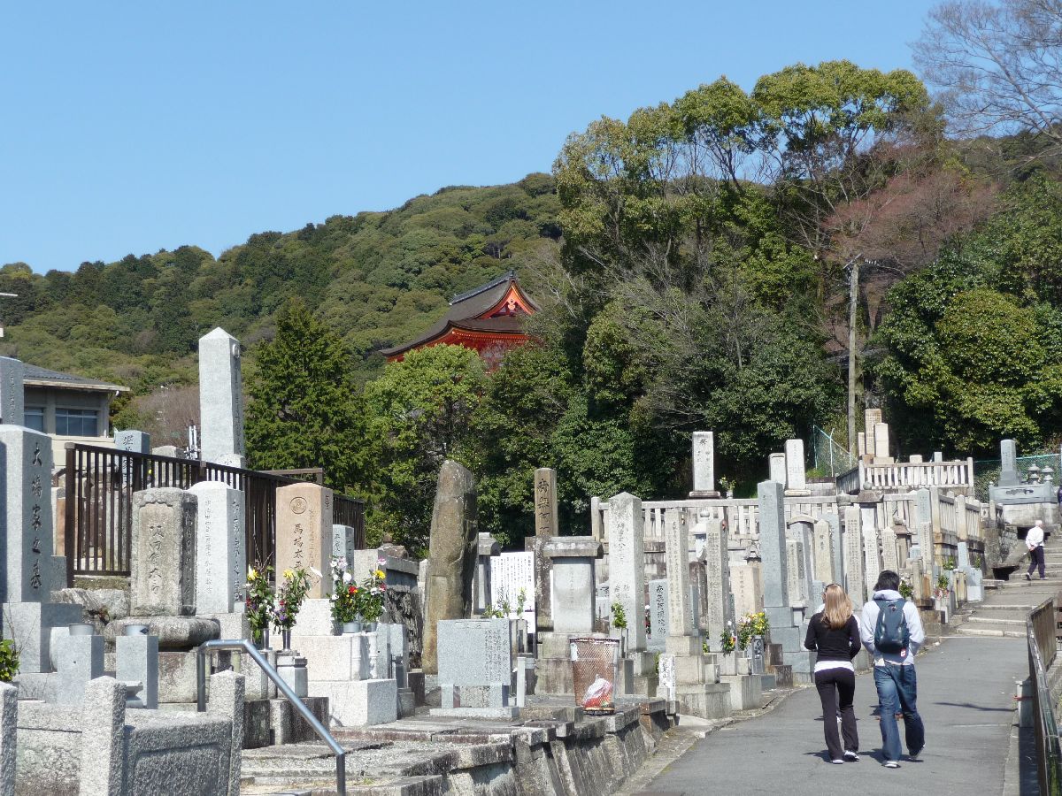Part of the graveyard was also to the left of the road. Here with the hills of Kyoto and a shrine behind it.