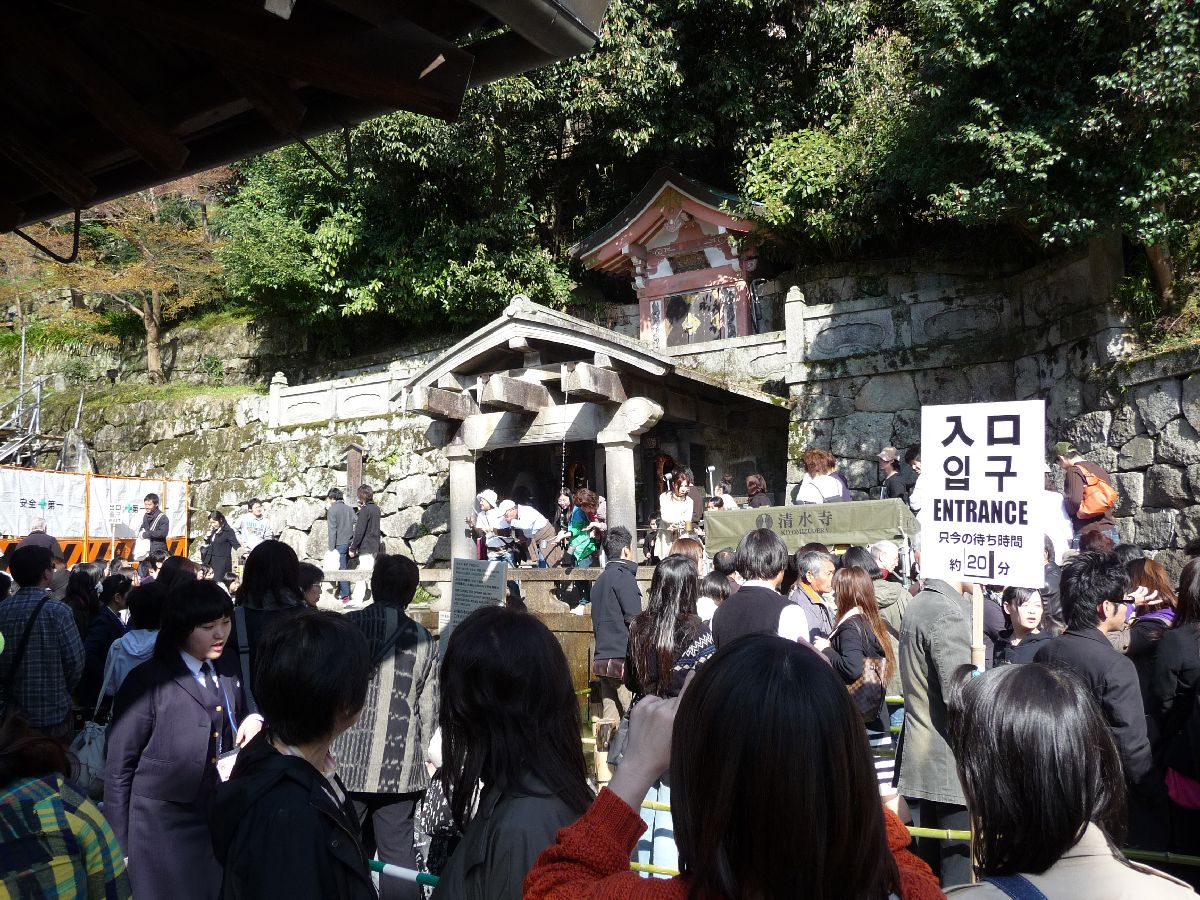 There is a waterfall by Kiyomizu-dera, and it said that its water can cure all diseases. Of course, a lot of people are attracted by this.
