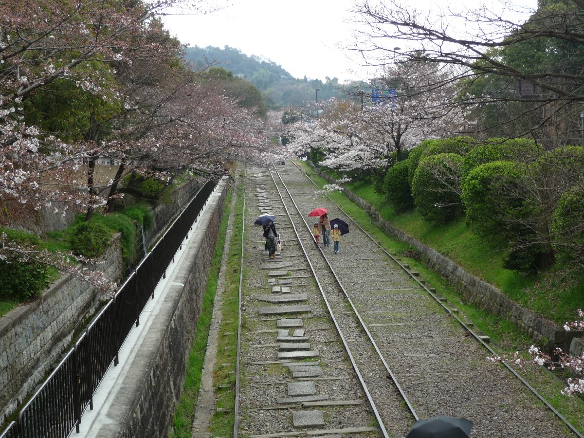 Do you recall that beautiful sunshine over Heian-jingu. Now it's two hours later, and it's raining. Thankfully, it took some time before it really started to pour, and very strategically I had lunch then. When I came out from the lunch, the rain had more or less ceased, but it was remarkably cooler. This is apparently an old railway bank. |