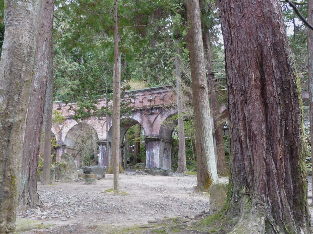 Next temple in line was called Nanzen-ji, but I cannot recall whether I that much temple. Maybe it was entirely forgettable. I do recall that there was a unusually big gate, which you could climb to catch the views. The only usable photo from up there ended up in the Cherry Blossom Special (picture 33). To me Nanzen-ji appeared mainly as a forested park. But suddenly there was a surprise: something very reminiscent of a Roman aqueduct! |