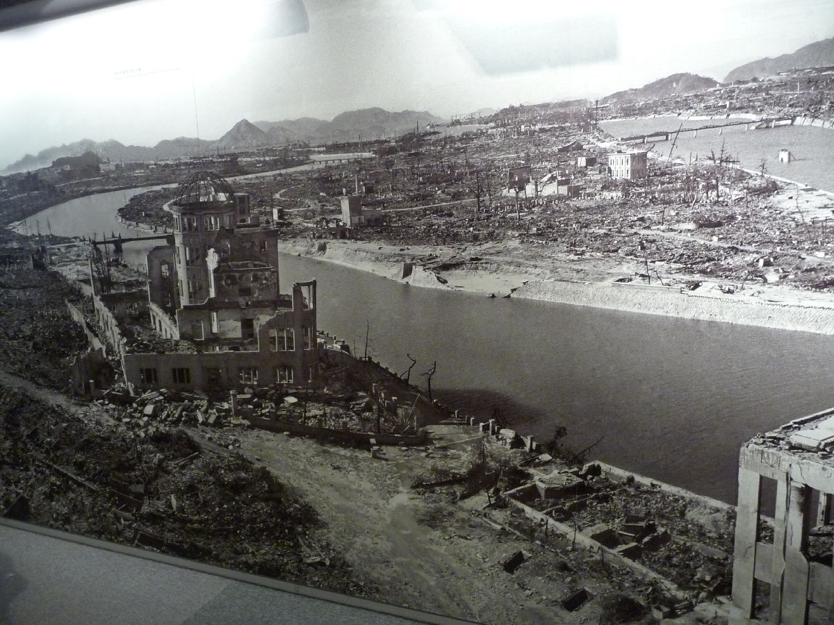 En bild från muséet med den förstörda mässhallen i förgrunden, och det så gott som helt ödelagda Nakajima i bakgrunden.