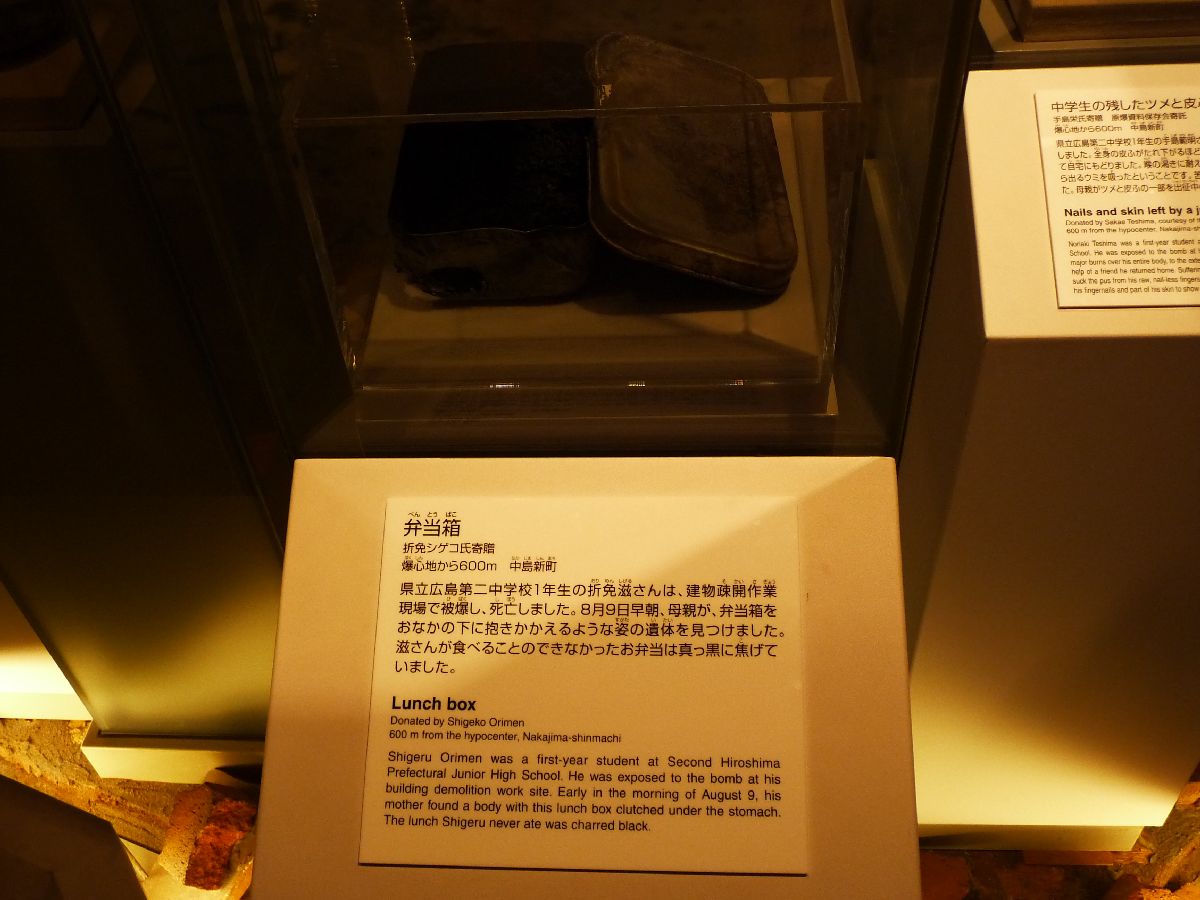 Muséet har många objekt som hittades efter smällen och som olika människor har skänkt. Här en atombomad matlåda.