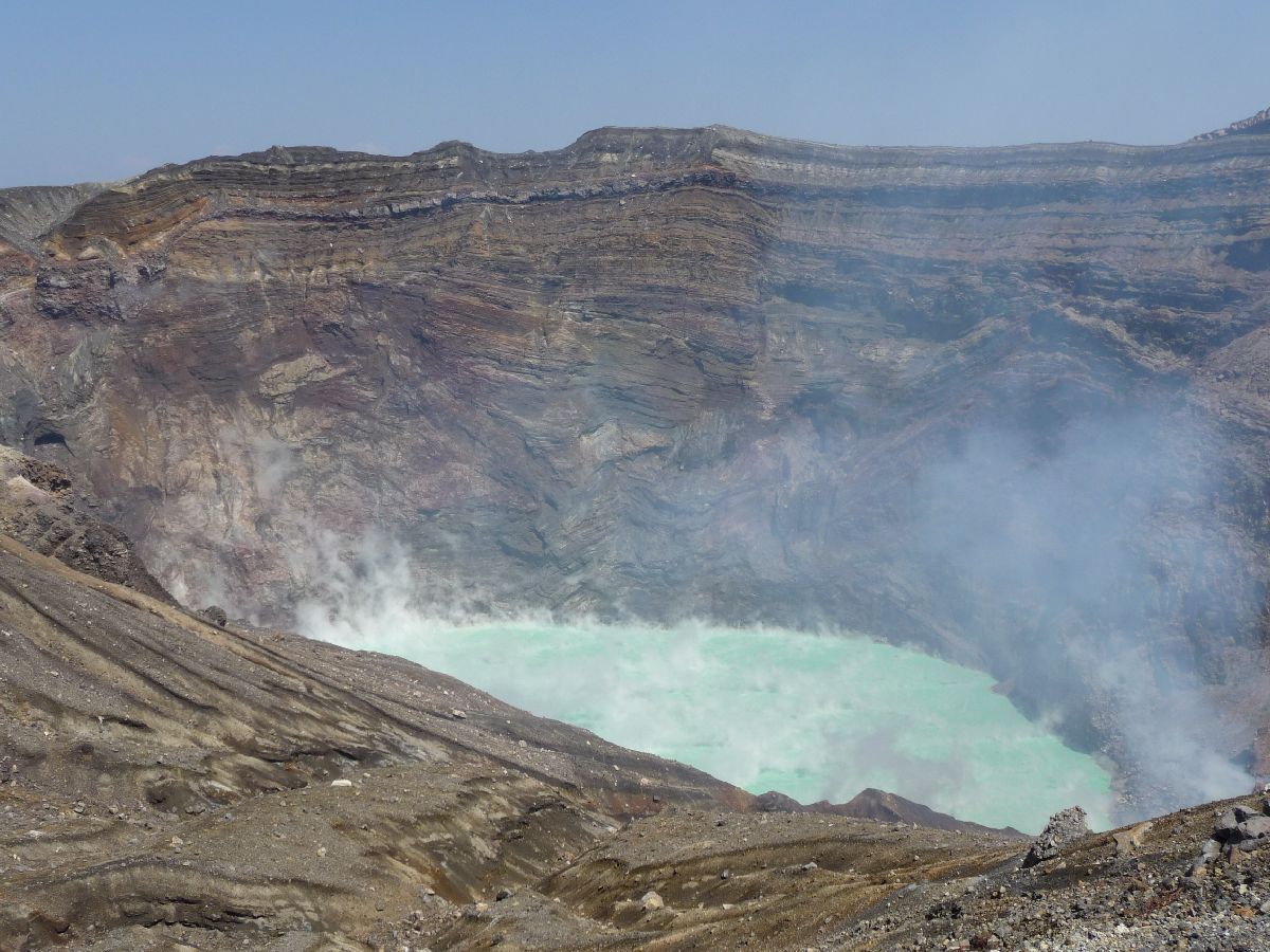 This is how it looks like. A hole with a turquoise surface that constantly is fuming and bubbling. And there is a smell of sulphur.