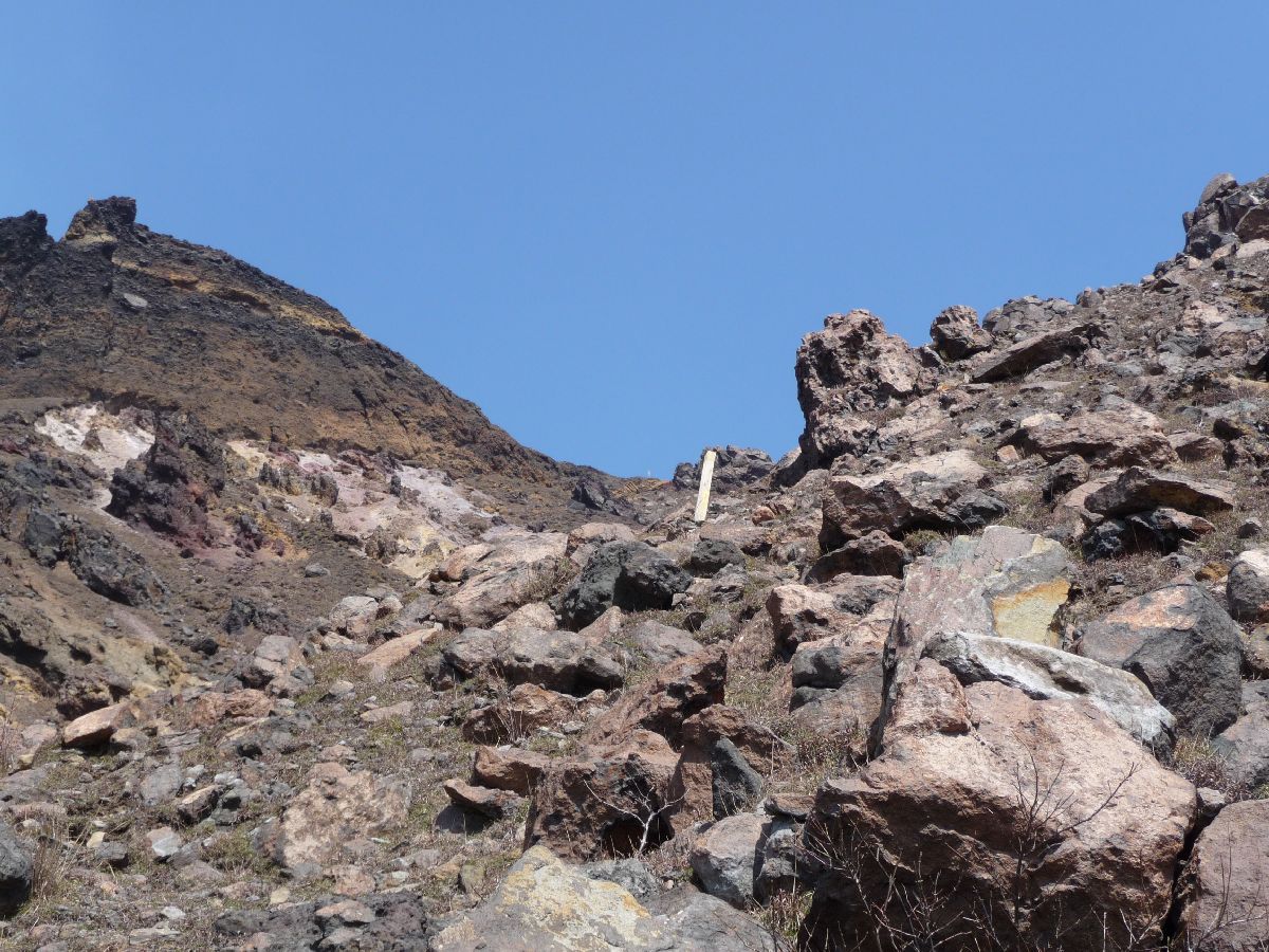 The trail now leads up, and the white poles indicate where it is. Notice that there is small white spot where the mountains meets the sky.