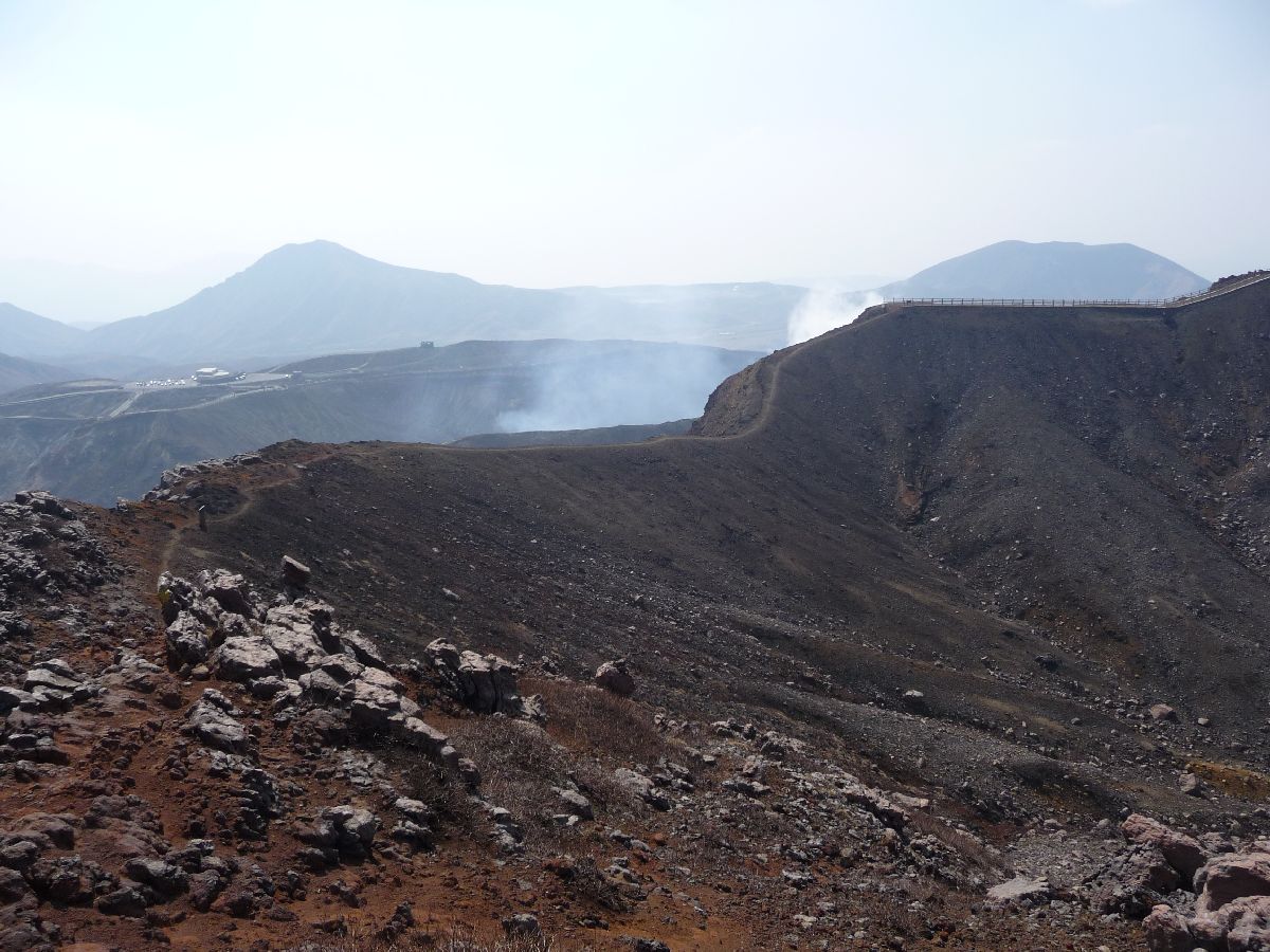 Here we see across the volcano to the first observation place. The smoke is coming from the volcano, in case you missed it. :-)