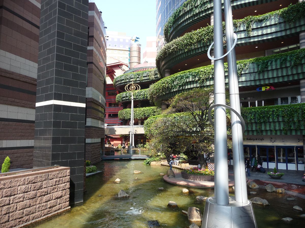 I'm back to Canal City, the big shopping centre in Fukuoka, but this time by the main entrance which is on the river. One has to say that the pond and the all lush green make it seem quite peaceful.