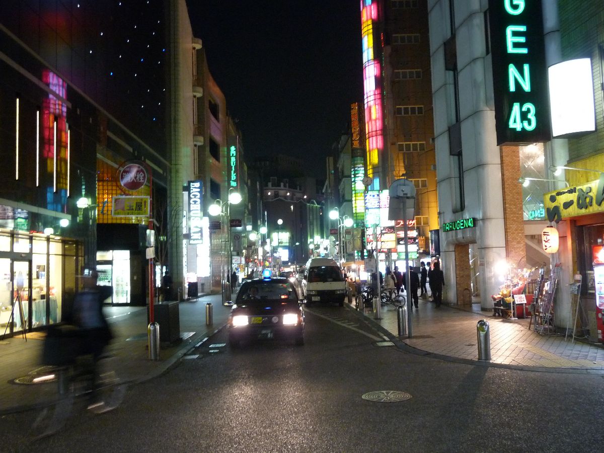 I took the bus back to downtown, and for a change I had dinner at a Chinese restaurant, and then I walked back through Nakasu on my way back to the station. This is the same street as in picture 14, but now lit by neon lights. |
