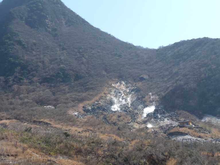 I Owakudani ryker och bubblar det om marken. Och svavel luktar det. Man kunde gå fram till det lilla gula huset och där titta på några bubblande pölar i närbild. Och koka ägg om man tycker att det är kul. Bysst med folk där, men så spännande var det inte. Linbanan fortsätter från Owakudani ner till Ashino-sjön, som är Hakone-områdets största sjö. Men just då var den delen av linbanan ur drift, så jag började gå ner för backen i stället. Det var trots allt en naturpromenad jag hoppades på. |