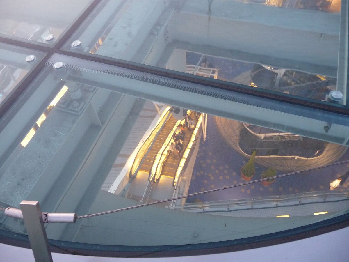 An illuminated escalator seen through the water on the roof on Oasis 21.