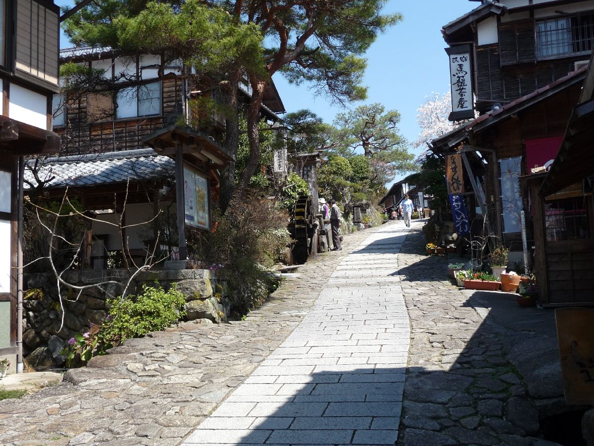 The village street in Magome. Or at least the street where the tourists are supposed to hang out. Modern things like cars and antennas are banned, while waterwheels are more in line with the expectations. However, most houses are actually from the 20th century. (Fires are not uncommon and take their toll.) |