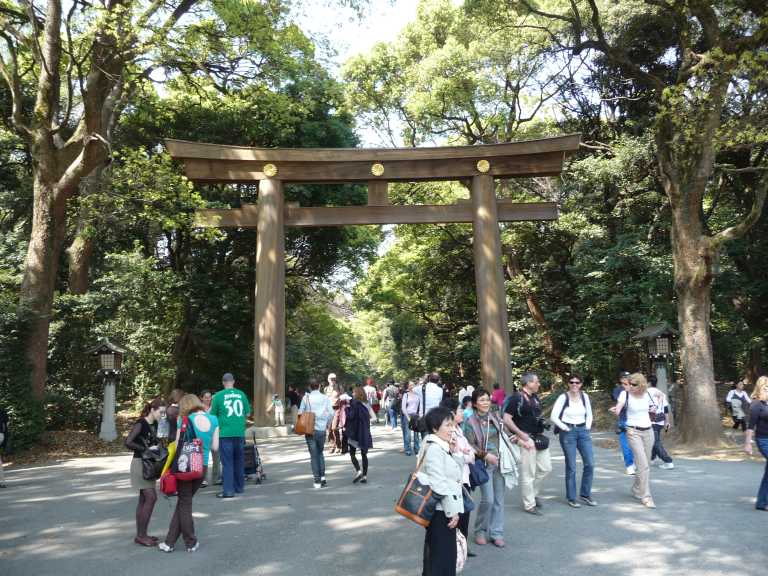 Den stora skogen jag såg från TMGB är Meiji-jingu, en stor shinto-helgedom, tillägnad kejsare Meiji som tillträdde någon gång innan 1868 och som satt på tronen till 1912. Hans namn är förknippat med Meiji-restorationen, då Tokugawas shogun-regim upphörde och den (representativa) kejsarmakten återupprättades. En söndag som denna är det många som kommer till Meiji-jingu, om det nu är av religiösa skäl, eller bara för att njuta av grönskan. Den här är torii-bågen som markerar ingången till parken.