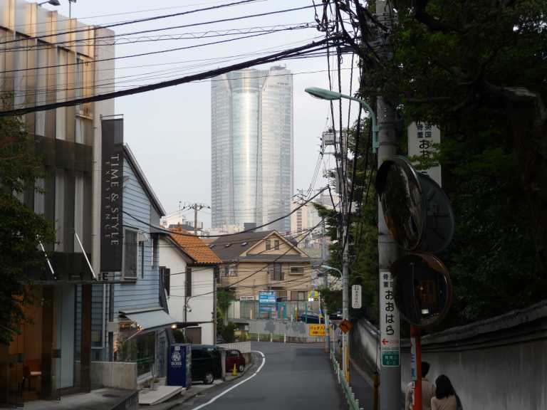 Vid nästa korsning svänger Omotesando vänster och blir bara en genomfartsgata. Här i korsningen syns den sista exklusiva affären till vänster, parken till ett tempel till höger och små hus rakt fram. Och längre bort en skyskrapa. Jag fortsatte rakt fram nerför backen. |