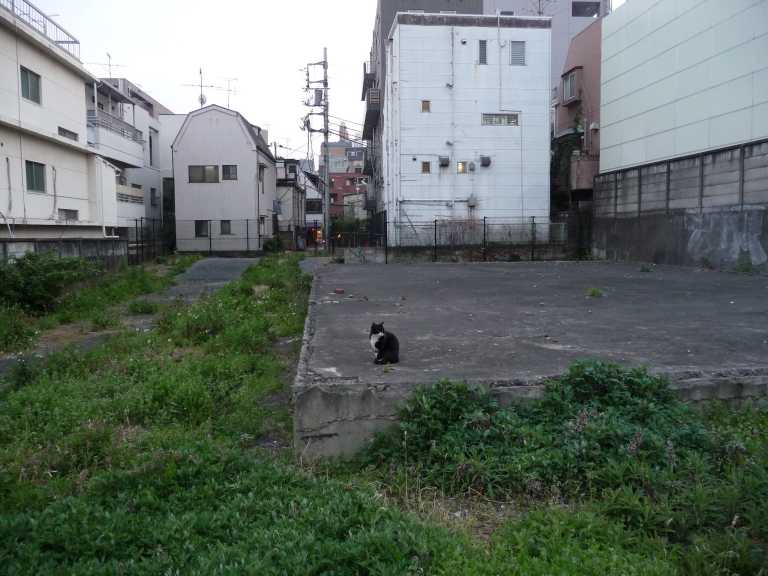 Och mitt i Tokyo där marken inte är billig, så går jag förbi en obebyggd tomt. Med katten blev scenen oemotståndlig.