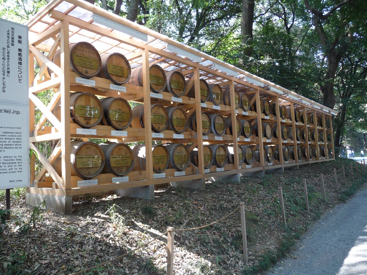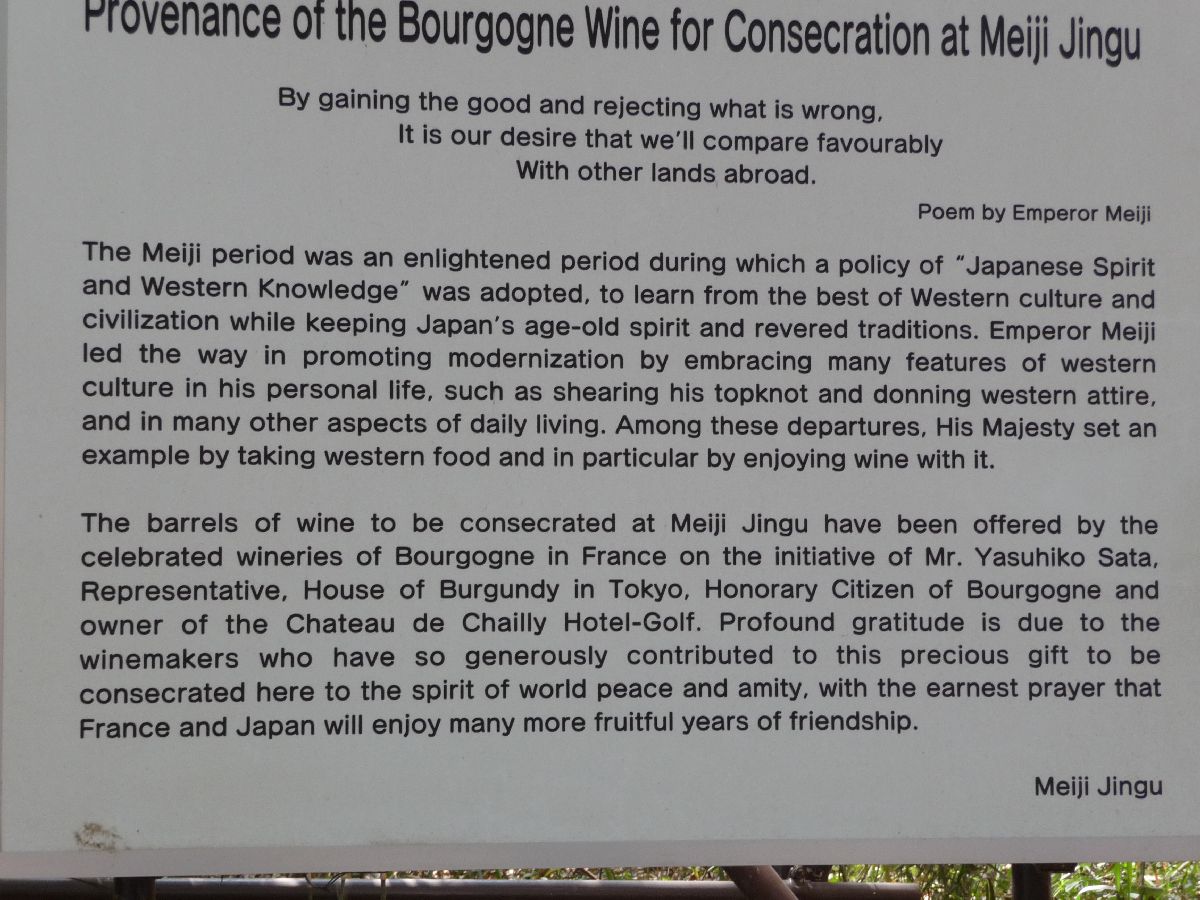 En massa vintunnor, onekligen en smula överraskande. Men kejsare Meiji var tydligen en vinkännare. Mer detaljer finns på en sidobild där jag fotat skylten brevid.