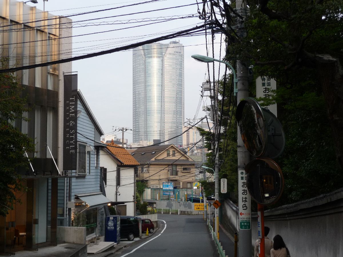 Vid nästa korsning svänger Omotesando vänster och blir bara en genomfartsgata. Här i korsningen syns den sista exklusiva affären till vänster, parken till ett tempel till höger och små hus rakt fram. Och längre bort en skyskrapa. Jag fortsatte rakt fram nerför backen. |