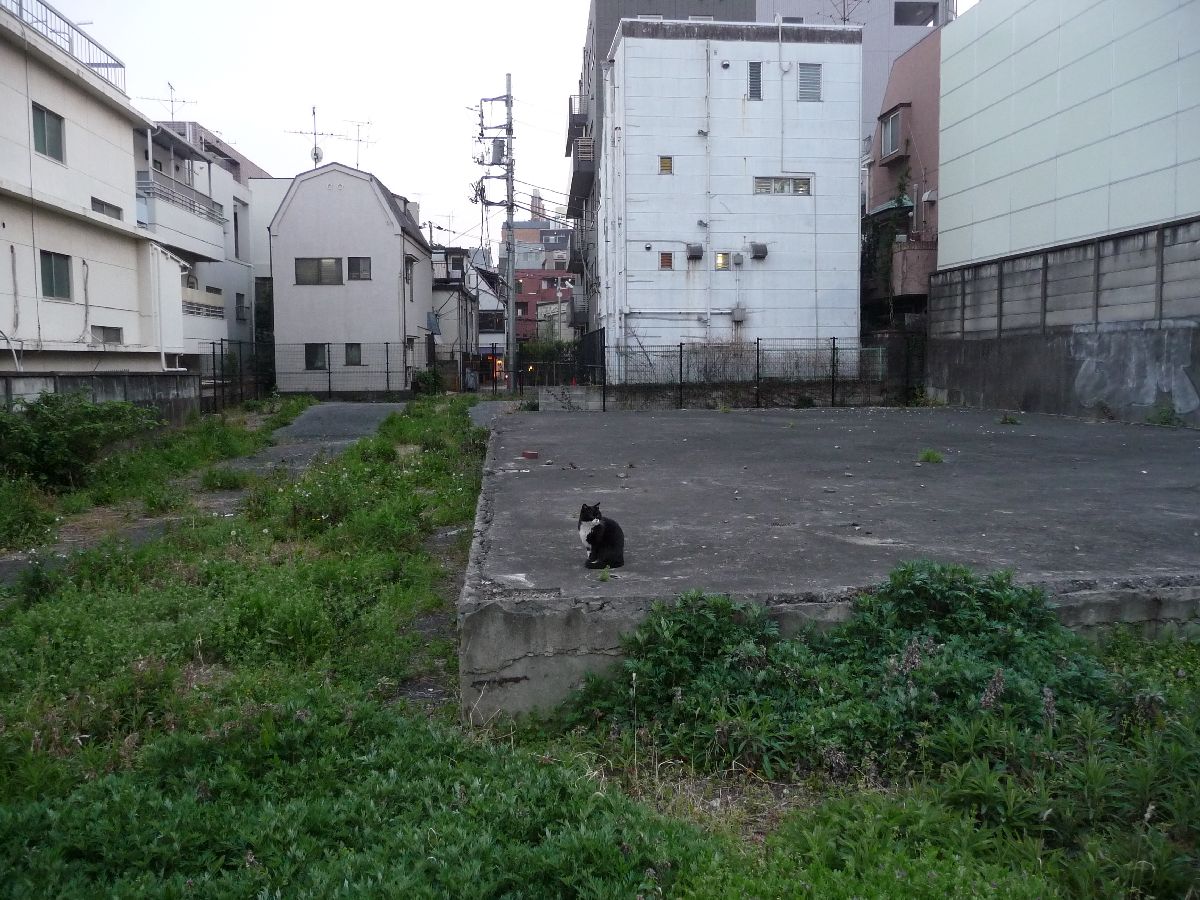 Och mitt i Tokyo där marken inte är billig, så går jag förbi en obebyggd tomt. Med katten blev scenen oemotståndlig.