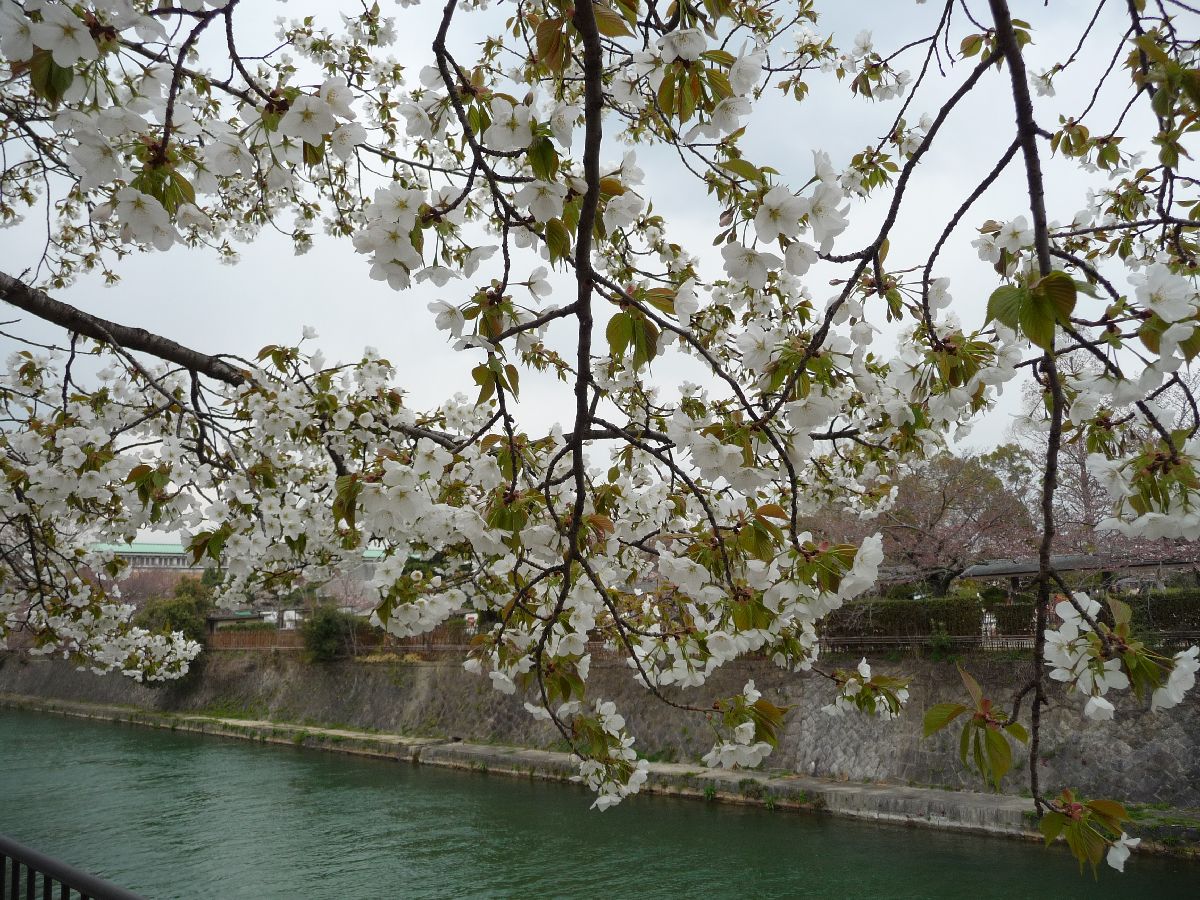 Et blommande träd (jag tror inte det här är körsbärsblom) över en å i Kyoto.