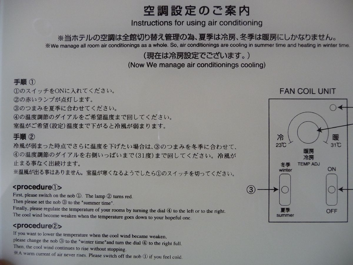 Bruksanvisning till luftkonditioneringen på hotellet i Hiroshima. Ännu ett exempel på engelska på japanska.