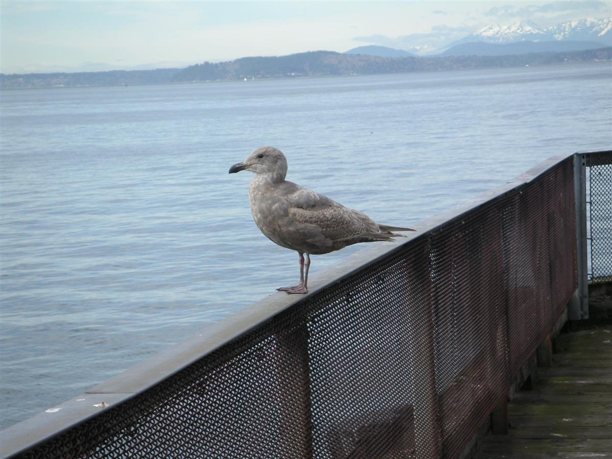 En fin fågel på en pir och snötäckta berg i bakgrunden.