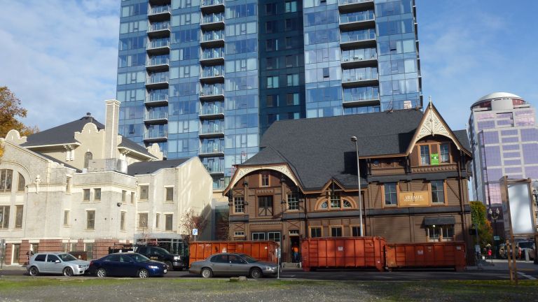 En kontrastrik bild med hus från tre olika generationer. Den gamla villan till höger var stadd under renovering vid mitt besök.