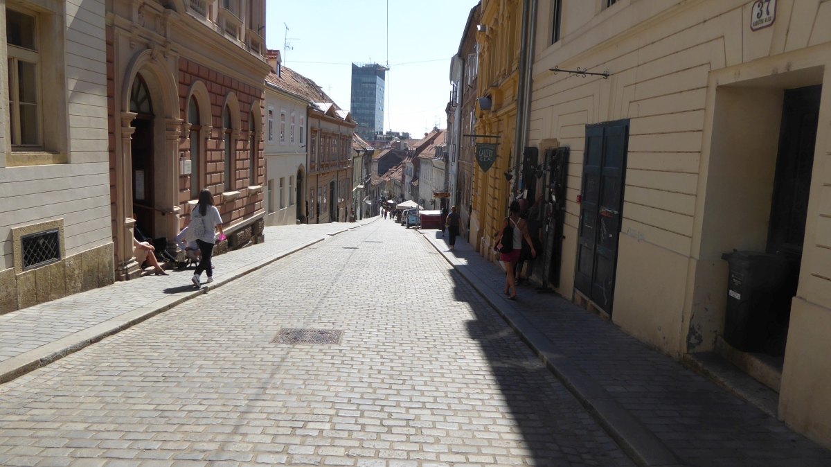 En gata i Gradec, som är ett lugnt område, med utsikt mot de nedre delarna av Zagreb.