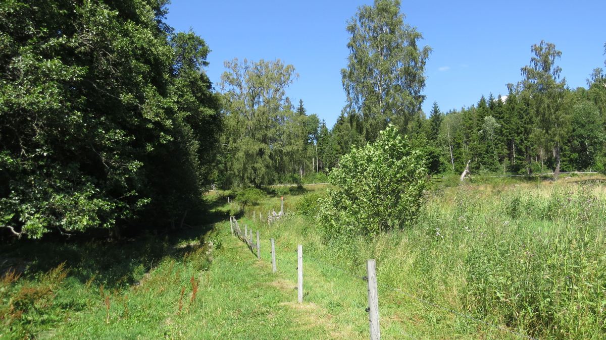 En bit av Sörmlandsleden vid Hallsfjärden söder om Södertälje. Vattnet syns inte, men träden till vänster står i strandkanten.
