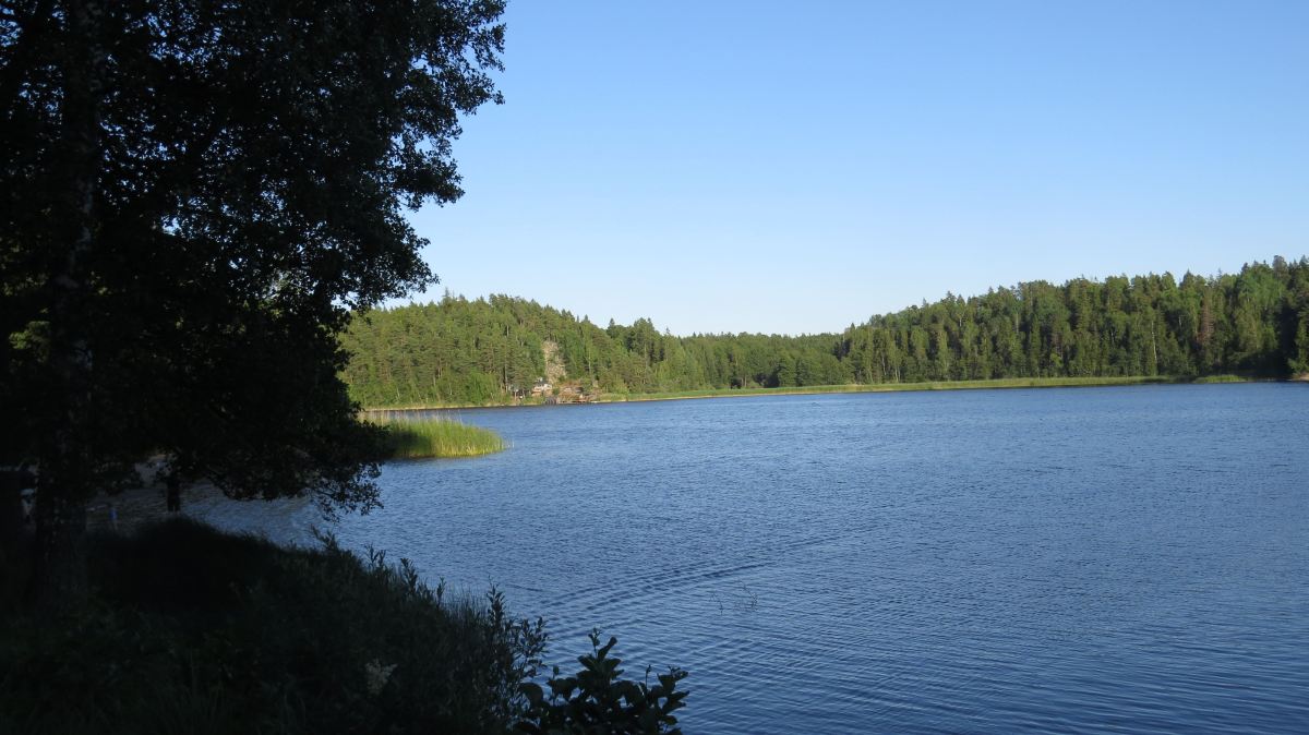 En vy från Lida Friluftsgård där det finns en stor badplats vid sjön Getaren. Huset som skymtar på andra sidan sjön går bara att nå över sjön. Någon gång för en massa år sedan försökte jag ta mig runt sjön för att se om det fanns någon bra badklippa någonstans. Blev lite förvånad när jag lett min cykel längs vad som knappt var en stig och kom till ett hus, och det fanns inte mycket mer till stig på andra sidan huset heller. |