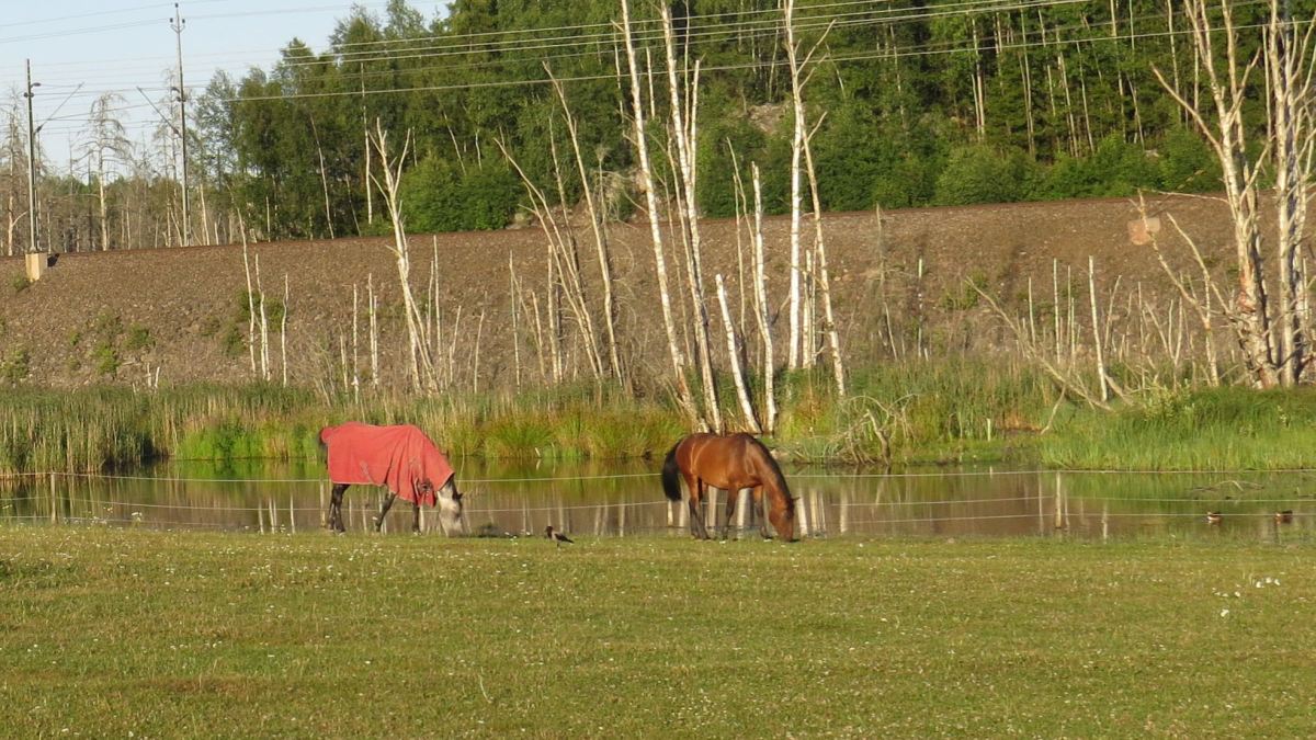 Två hästar vid en pöl vid Grödingebanan. Och en råka som råkade komma med.