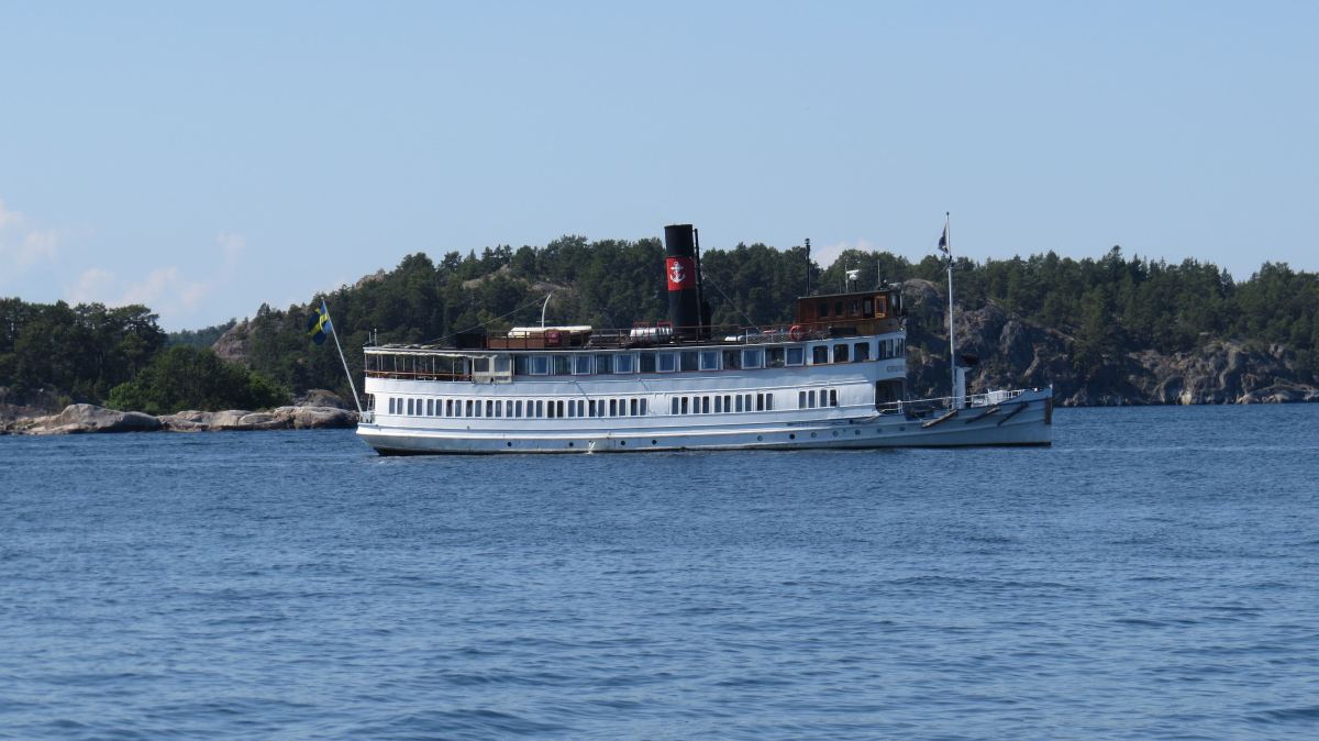 En riktigt varm dag åkte jag ut till Grinda, och ute på redden låg en Vaxholmsbåt och drev omkring. (Jag förmodar att den var parkerad för att göra en tur senare.)