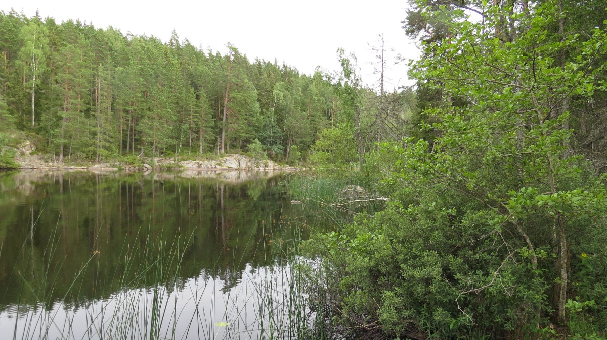 | Jag kom till denna sjön på västsidan, men ville komma runt till östsidan och de fina badklipporna, men det var rätt trassligt att passera utflödet ur sjön. Jag lyckades till slut komma dit, men utan mina pinaler – jag fick slå läger på västsidan och simma över. | ||