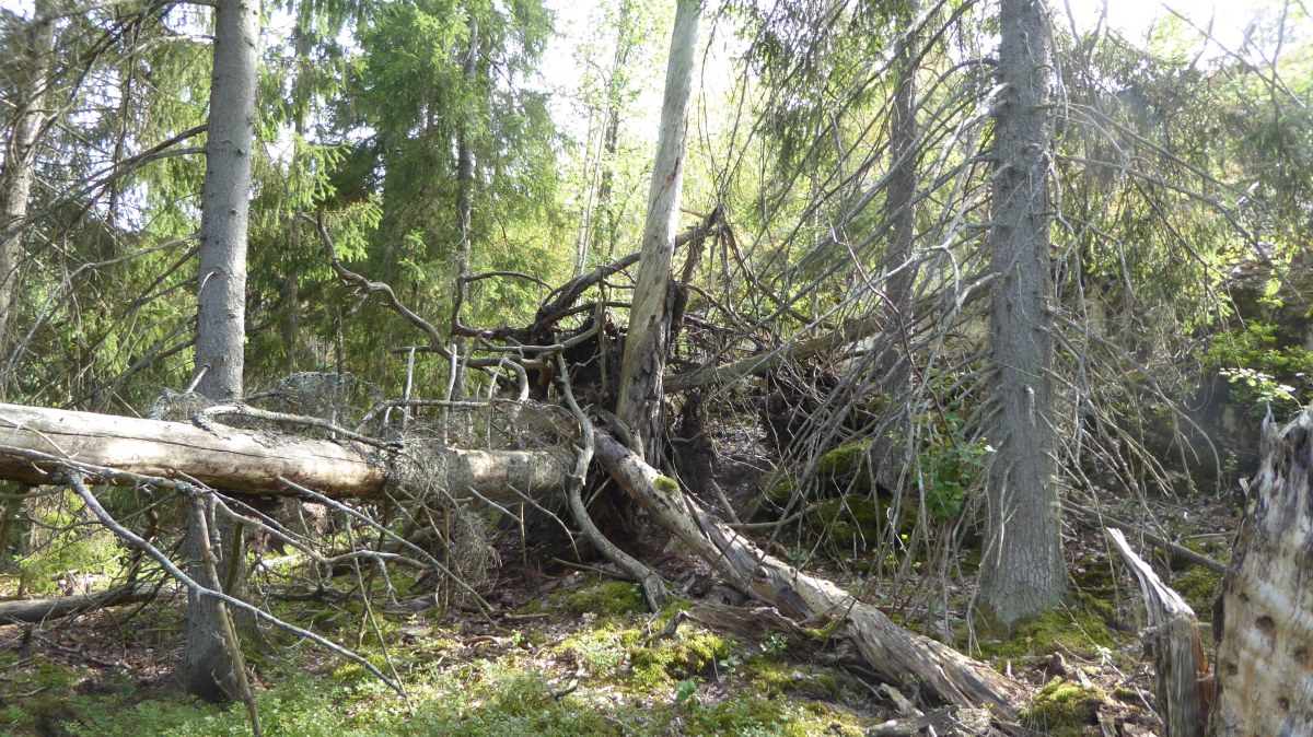 Jag såg på min karta och noterade en stig som jag inte lagt märke till tidigare. Jag var lite undrande, för den skulle mynna ut på en stig jag gått många gånger, utan att notera någon korsning. Likväl, bestämade jag mig för att prova den. Och, jo, här och vad såg jag spår av en stig, men den har uppenbarligen inte hållits öppen de senaste decennierna, utan det var en röra utan dess like av fallna träd m m. Det var ett litet äventyr att passera! |