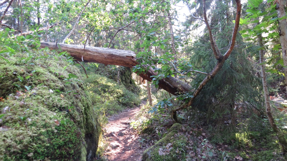 A scene from the forest there a tree has fallen over the trail and been broken.