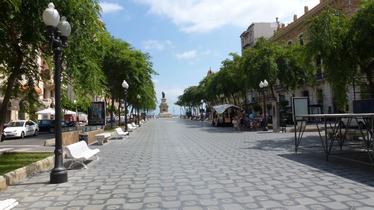 Det finns två ramblor i Tarragona. Rambla Vella som avgränsar gamla stan, men annars inte är något särskilt, och den nya Rambla Nova som vi ser här. Den börjar uppe vid Balcó del Mediterrani där det finns många kaféer och mellan körbanorna finns det ett brett flanerstråk. Just nu är det söndageftermiddag, och synnerligen lugnt. |